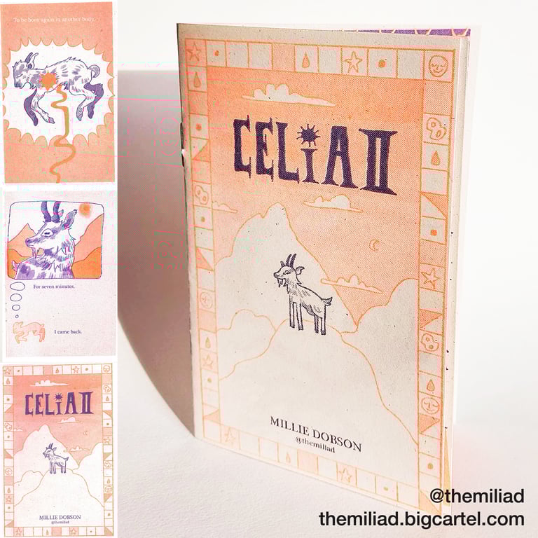A6 risograph zine - collated ideas and story of the Celia the Pyrenean Ibex and her brief de-extinction